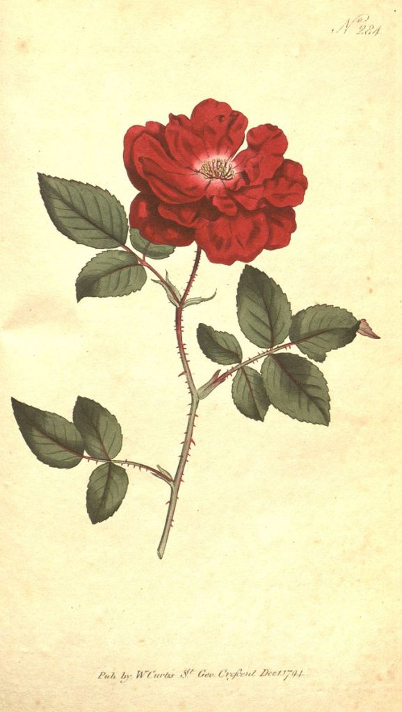 - William Curtis, The Botanical Magazine; or Flower-Garden Displayed, Vol. 8, Plate 284, December 1794, Rosa semperflorens | Ever-blowing rose [Rosa chinensis var. chinensis, as Rosa semperflorens]. Wikipedia commons Rosa semperflorens Curtis.