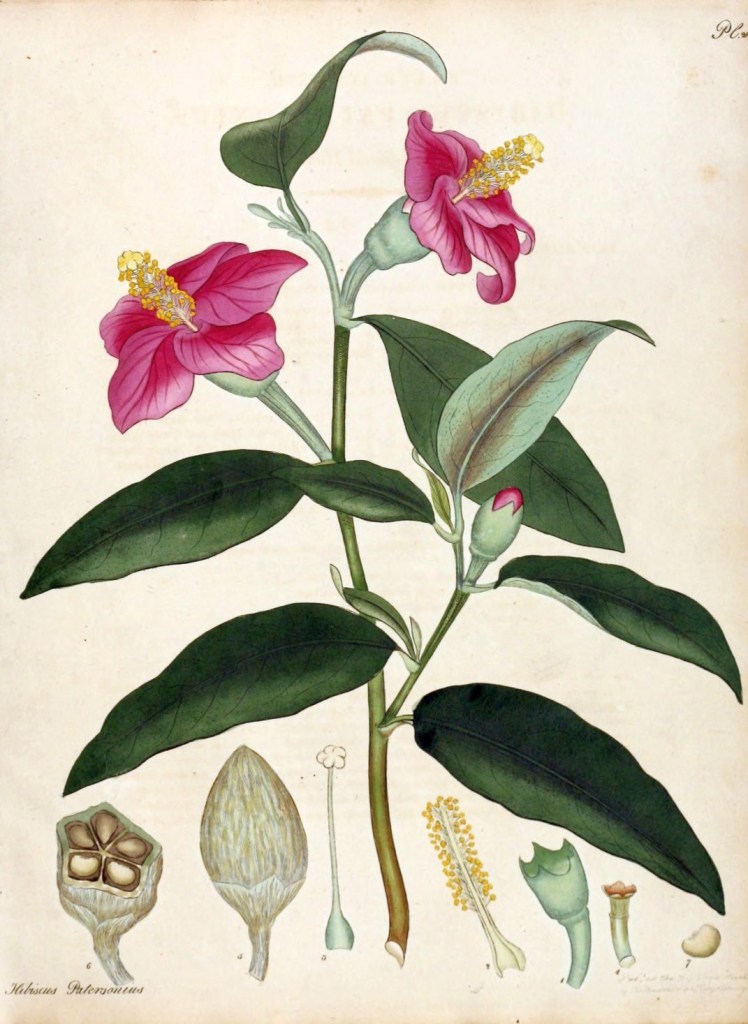 - 1803 Henry Cranke Andrews, The botanist’s repository, for new and rare plants, vol. 4, plate CCLXXXVI, Hibiscus Patersonius.