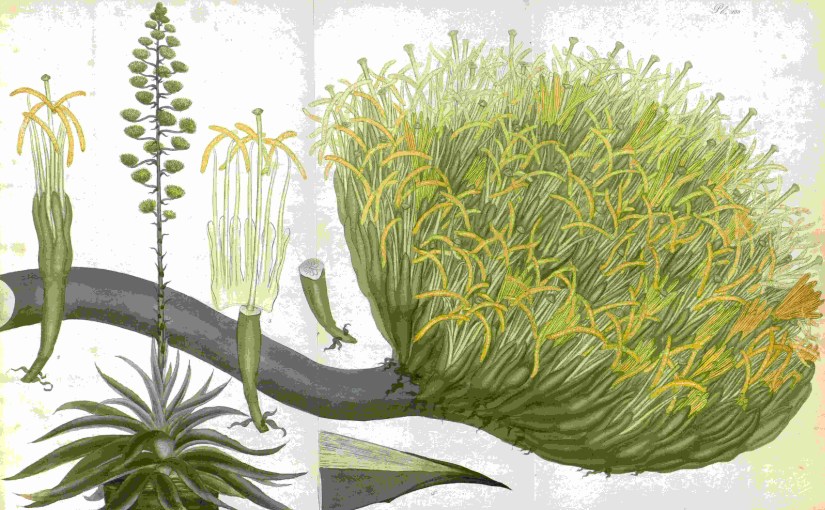 There are two great American aloes [Agave americana] in the orangerie of the Right Hon. Lord Borringdon, at Saltram, near Plymouth, one of them showing evident marks that it would blossom soon in full bloom, was removed for security, and to promote its blossoming in safety, by direction of Mr. Smith, principal gardener, and by order of the Right Hon. Lord Boringdon, from the orangerie into Saltram gardens, for the inspection of the curious in botany. There have been two of these grand plants that have blossomed in the last century, in the county of Devon; one about twenty-five years since at Powderham-castle, the seat of the Right Hon. Lord Courtenay; and a second about thirty years since blossomed in a gentleman’s garden at Salcombe, in the South-Hams, which at that time produced great profit to the respective gardeners, who exhibited it to the curious. [Agave, botanist’s repository vol. 7 plate 433 CCCCXXXIII. ‘Our figure was made from two plants at Kensington Gore, each bearing 2000 flowers, and about 70 years old, belonging to J. Vere, Esq.’]
