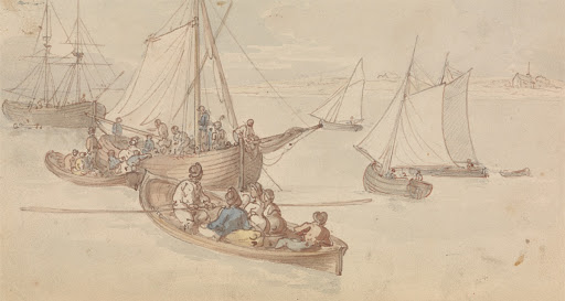 - Thomas Rowlandson (1756–1827), Pleasure boats in an estuary, undated, watercolour with pen and red-brown ink, over graphite on moderately thick, moderately textured, cream wove paper. Yale Center for British Art, Paul Mellon Collection, B1981.25.2668.