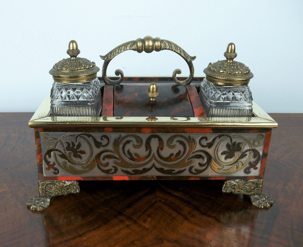 - Inkstand manufactured by the London jewellers, Wells & co. around 1809 -1820. ‘Most likely purchased by‘ William Courtenay (1777-1859); ‘recorded in the castle’s inventory of 1880 as being in the Green Satin Room and also photographed by Mark Girouard for Country Life Magazine July 18th 1963 as being in the Music Room.’ https://www.pareglioayresantiques.com/item/153/A-Late-Georgian-Early-Regency-Inkstand-of-the-Highest-Quality.